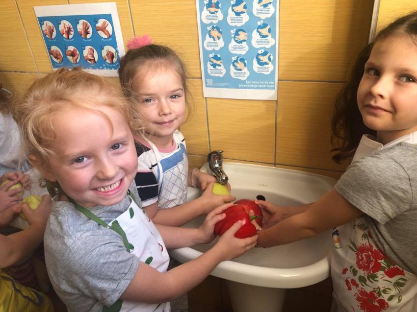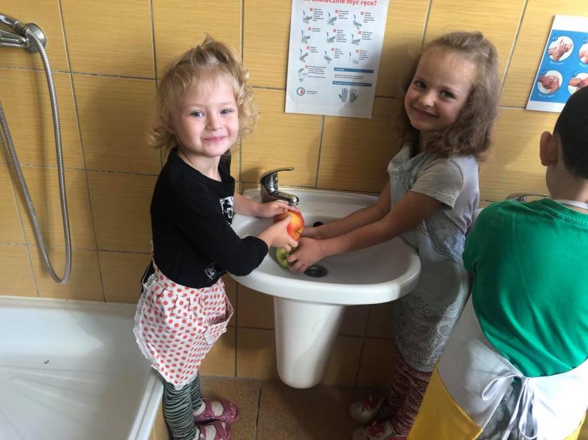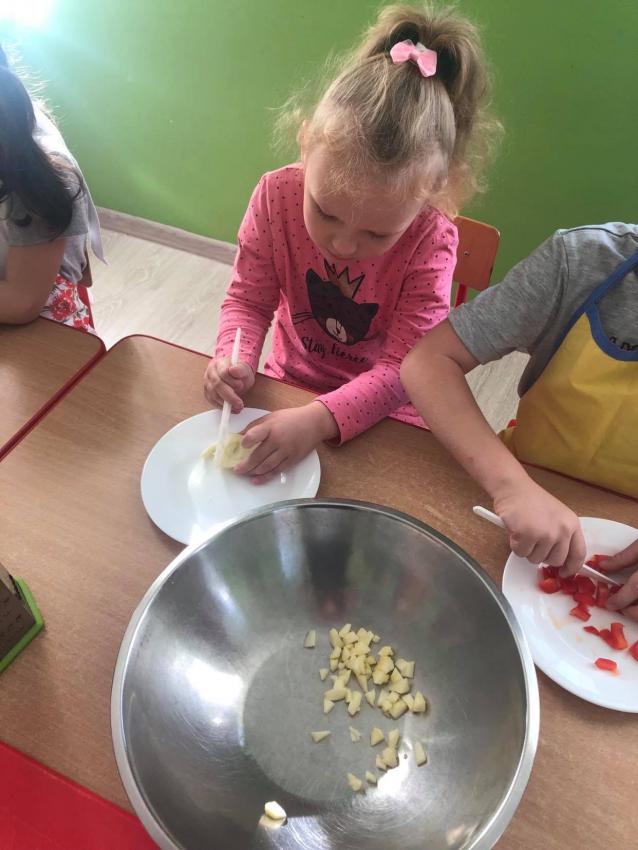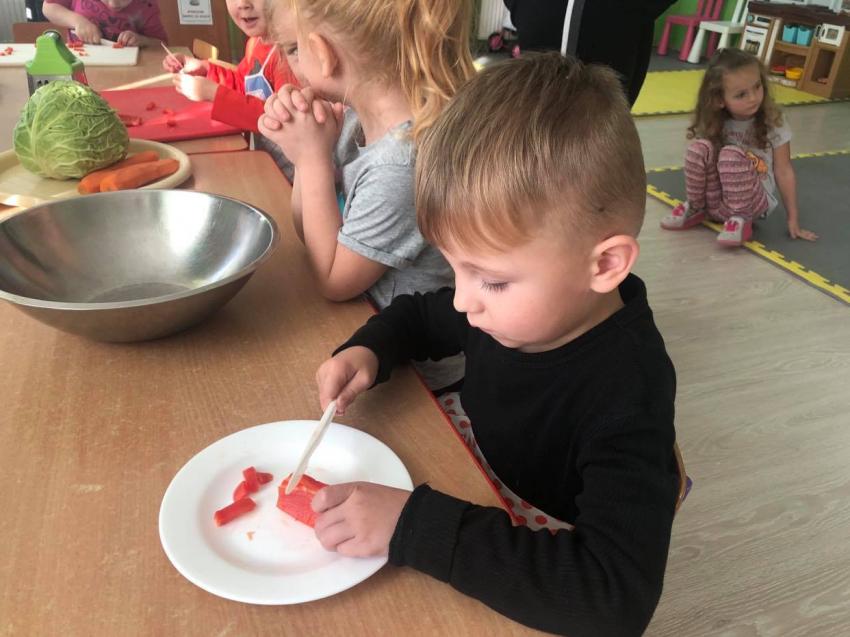 Dzieci z grupy 4-5 latków przygotowali surówkę ze świeżych owoców i warzyw.